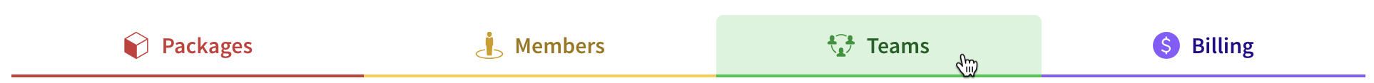 Note: New teams do not have members or package access by default. Once you create a team, add packages and members from the "Teams" tab.